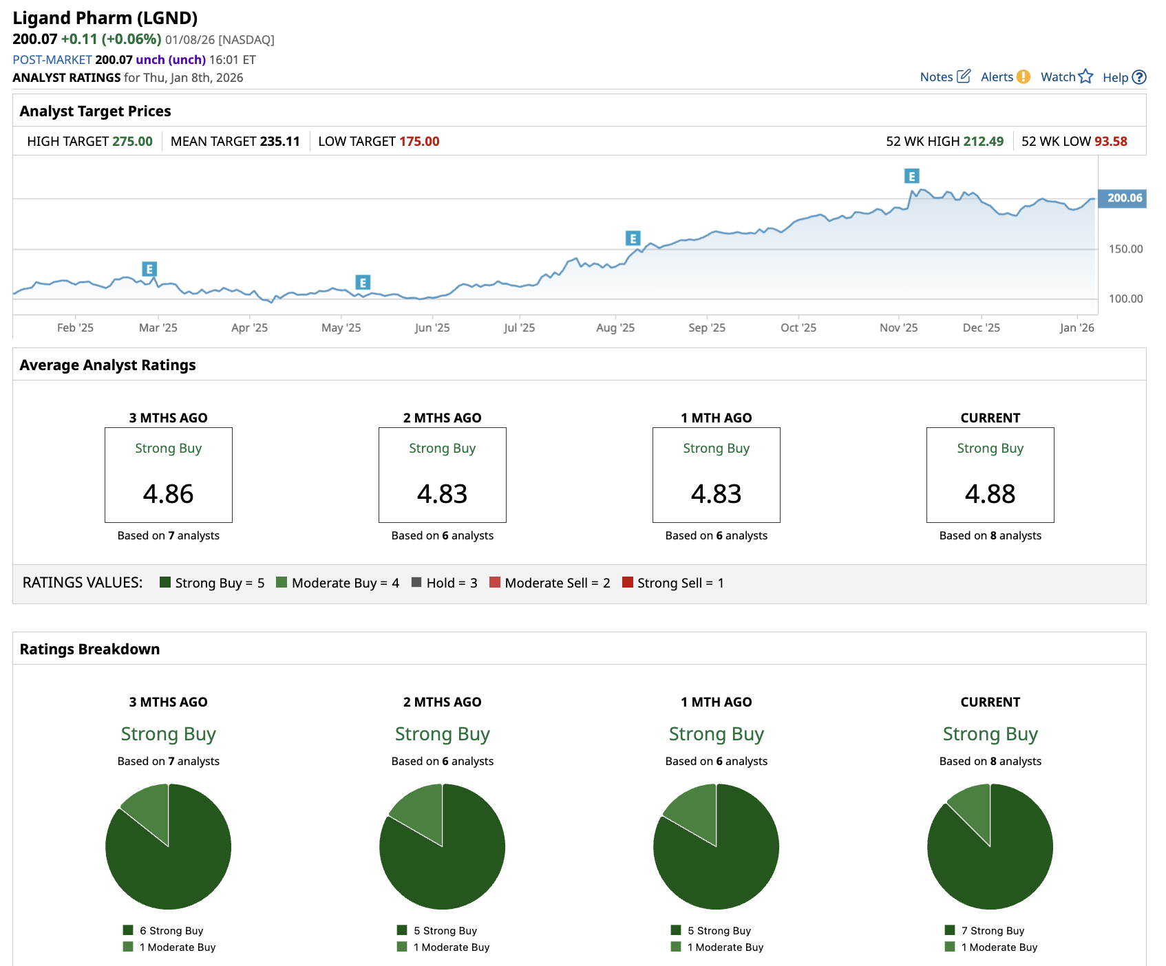 Out of the eight analysts covering LGND stock, seven recommend “Strong Buy,” and one recommends “Moderate Buy.” The average LGND stock price target is $235, below the current price of $200.