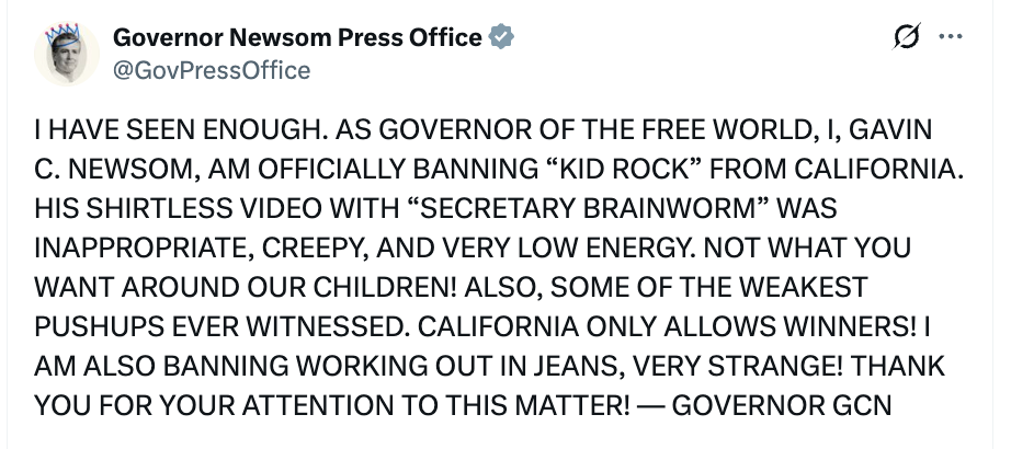 “I HAVE SEEN ENOUGH,” the governor’s official press office account posted on X. “AS GOVERNOR OF THE FREE WORLD, I, GAVIN C. NEWSOM, AM OFFICIALLY BANNING “KID ROCK” FROM CALIFORNIA. HIS SHIRTLESS VIDEO WITH “SECRETARY BRAINWORM” WAS INAPPROPRIATE, CREEPY, AND VERY LOW ENERGY. NOT WHAT YOU WANT AROUND OUR CHILDREN!”