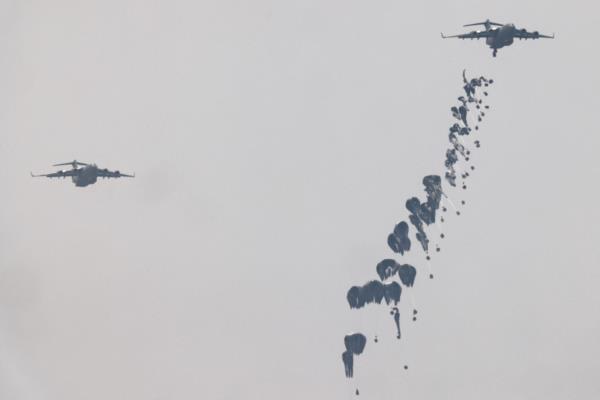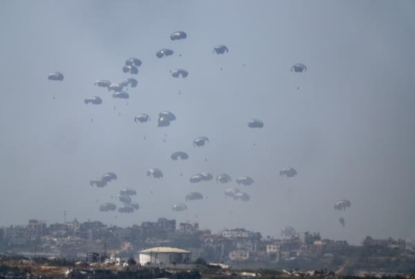 Humanitarian aid falls through the sky towards the Gaza Strip after being dropped from an aircraft, as seen from Israel