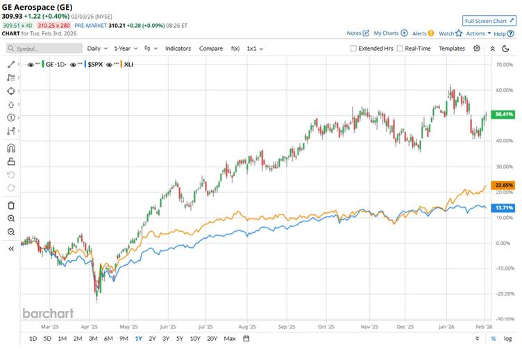 Narrowing the focus, GE Aerospace stock has also outperformed over the past year but lagged behind in terms of YTD performance, compared to the State Street Industrial Select Sector SPDR ETF’s (XLI) 23.3% surge over the past 52 weeks and 8.9% gains in 2026.