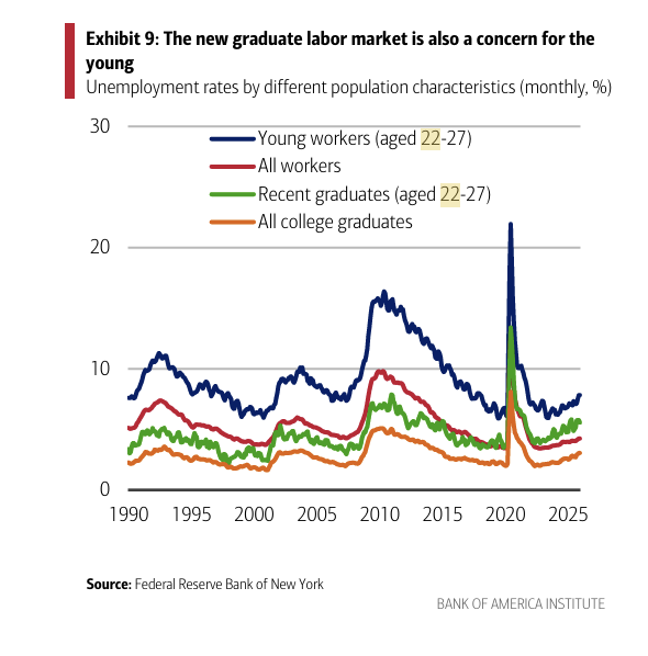 The labor market adds another layer of risk. Young workers aged 22-27 — including recent college graduates — are already experiencing unemployment rates markedly above the national average, according to data from the Federal Reserve Bank of New York. Many work in retail and leisure, the very sectors most likely to feel the pinch from a pullback in discretionary consumer spending, which would, in turn, eliminate the jobs those same young people hold. It’s a feedback loop that could hit Gen Z from both ends of the ledger: higher costs at the pump and fewer hours at work.