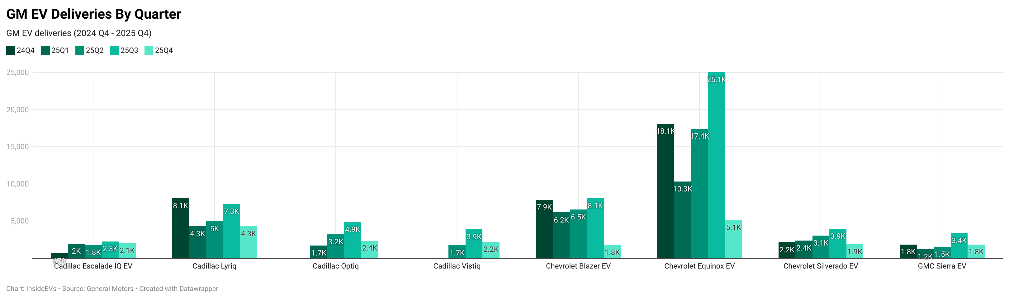 In fact, deliveries of every EV sold by GM took a hit last quarter. The Cadillac Lyric, for example, fell more than 45% year-over-year in Q4 while the Chevy Blazer EV nosedived nearly 80% compared to 2024.