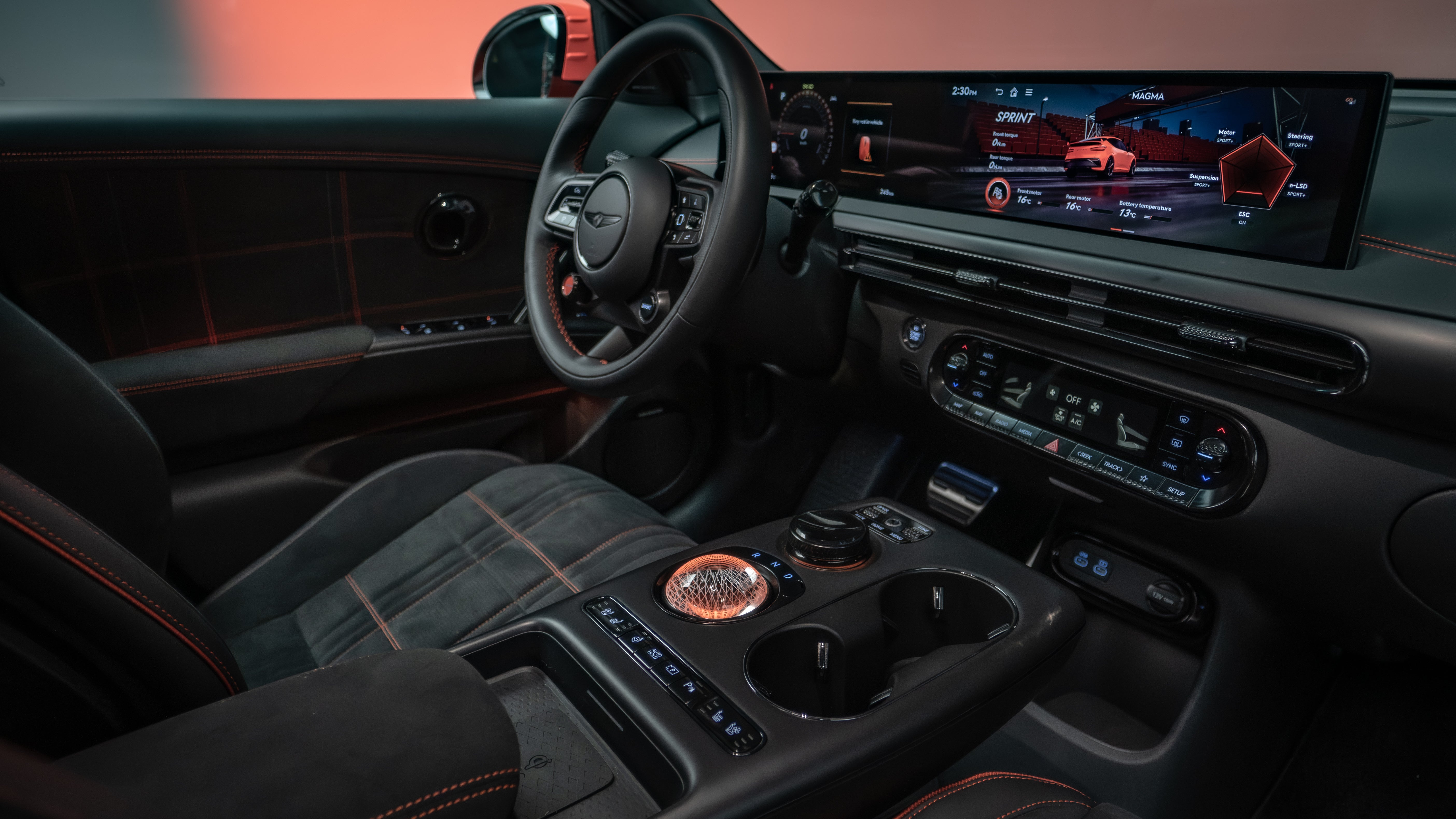 Inside, Genesis has combined performance cues with the brand’s established emphasis on materials and finish. The cabin features 10-way electrically adjustable suede bucket seats, available with orange or ash white contrast stitching, alongside aluminium detailing and Magma-specific trim elements.