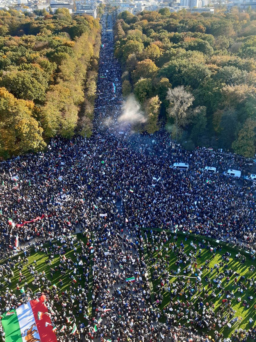 View of a demonstration near Berlin's Victory Column in Germany, as Tehran continues a violent crackdown amid anti-government protests following last month's death of Mahsa Amini in police custody, October 22, 2022 in this social media image. Twitter @Elmar_Iachi via REUTERS