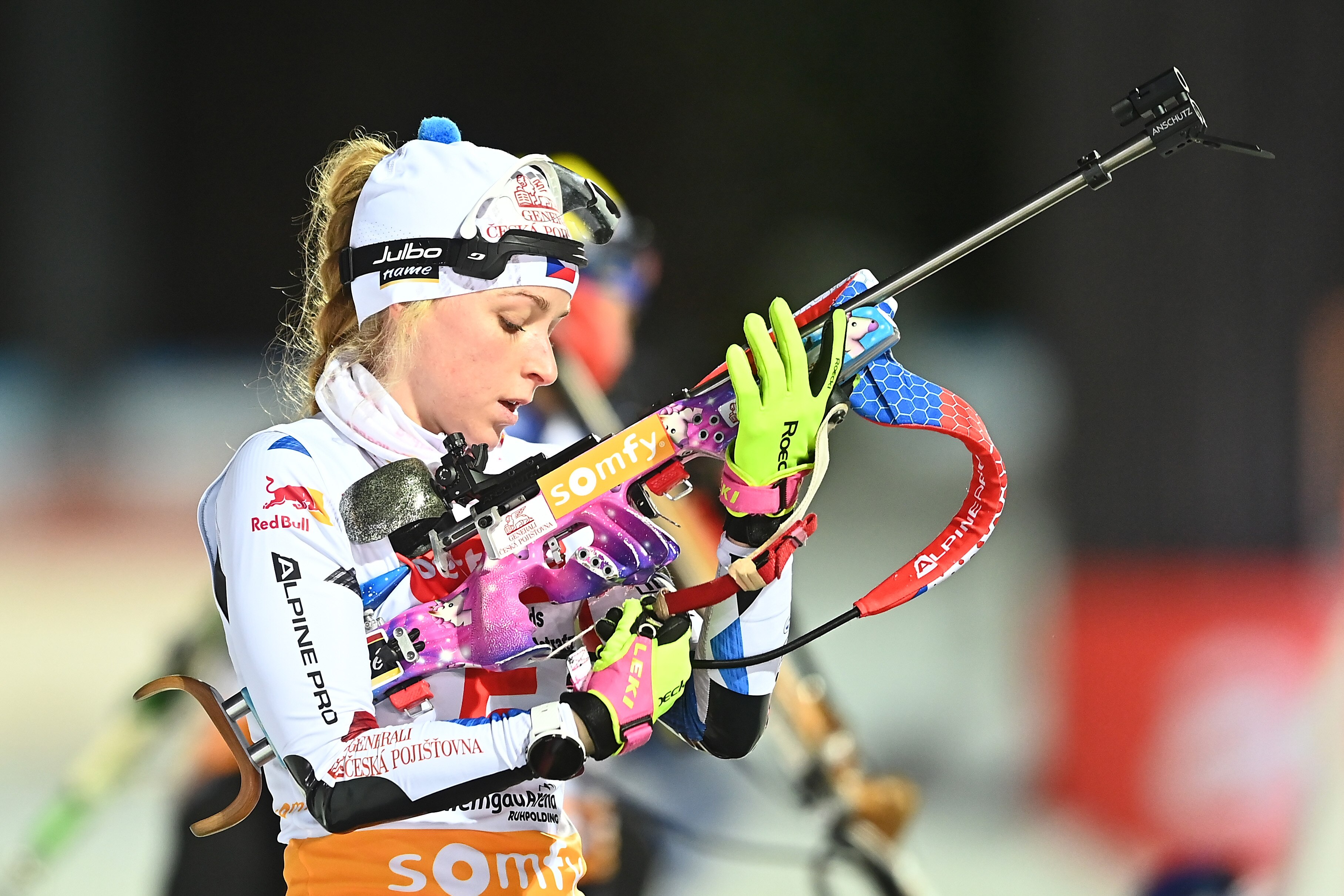 Competitors ski around a course before taking aim at five targets using rifles that they carry around on their backs.