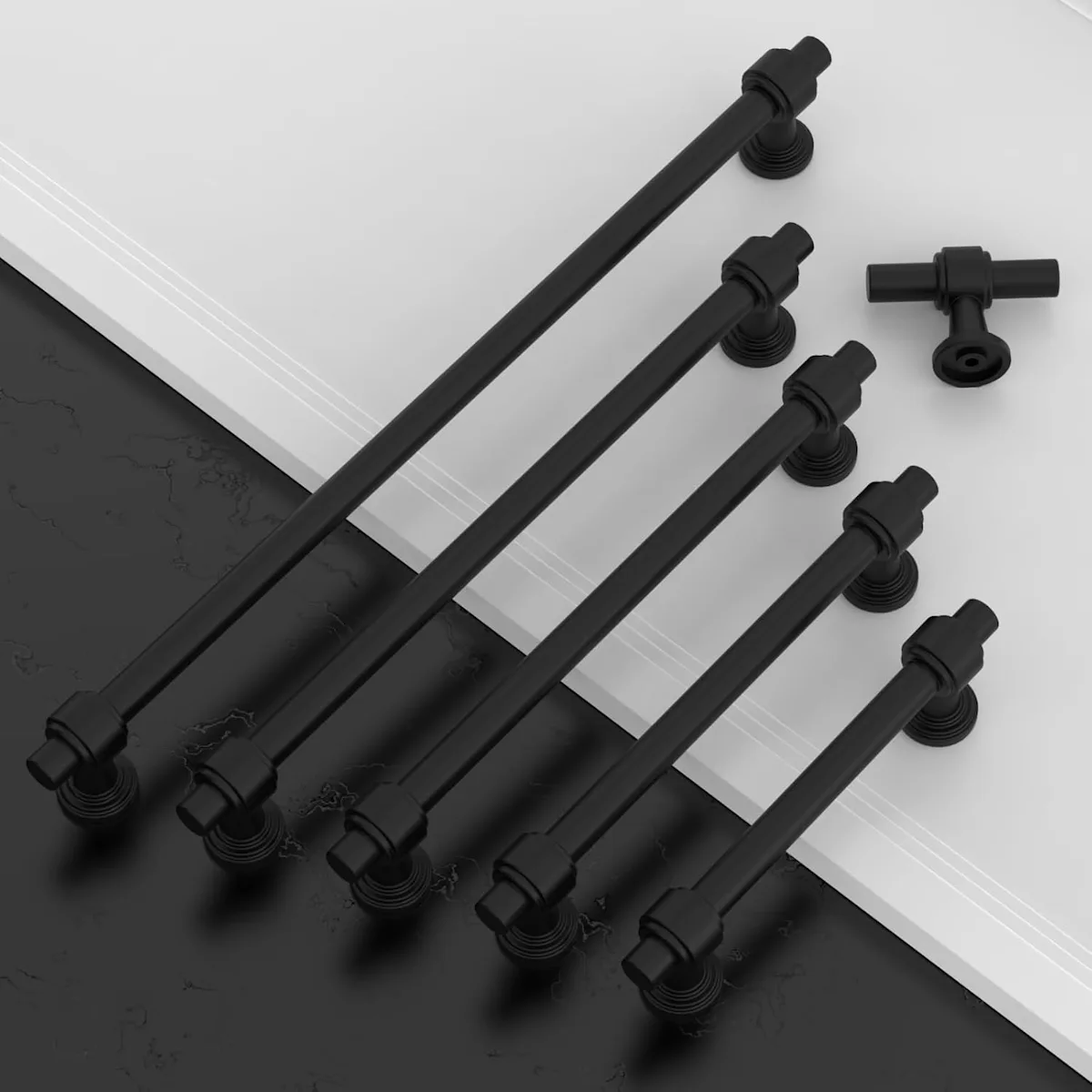 Matte black cabinet pulls made of a solid zinc alloy for durability