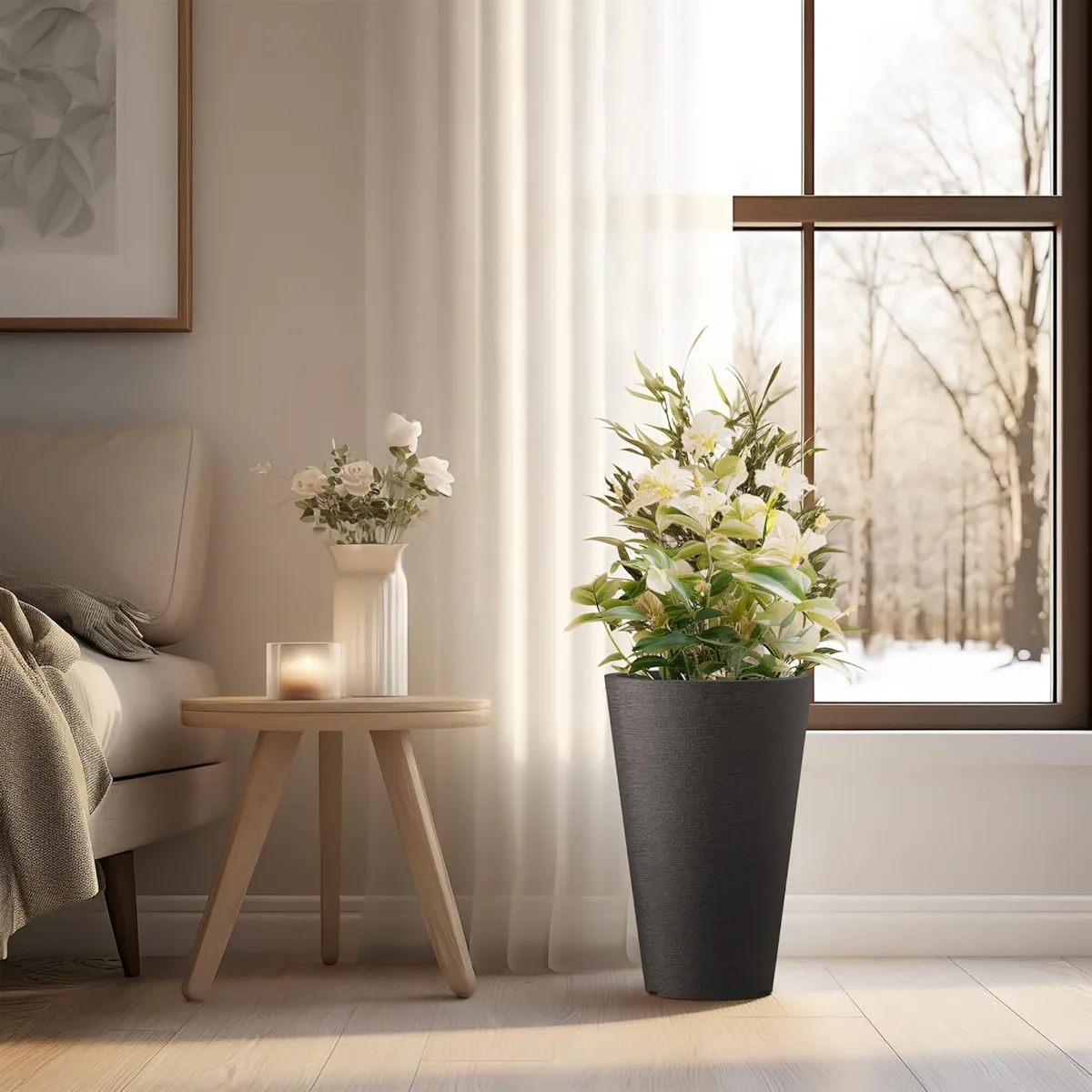 “Adding planters with flowers or greenery at the entryway immediately makes a home feel more inviting,” says Loren Taylor, landscaper and owner of Soothing Company. “Plants bring color, texture, and life to spaces that might otherwise look plain. Even simple arrangements create a welcoming, high-end feel without much effort.” These have a chic black finish and a textured surface, making them look much more expensive than they are. They’re also lightweight and contain drainage holes at the bottom.