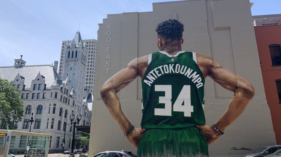 Displayed on the side of a downtown Milwaukee building, it shows Antetokounmpo from the back, in his green jersey, hands on hips.