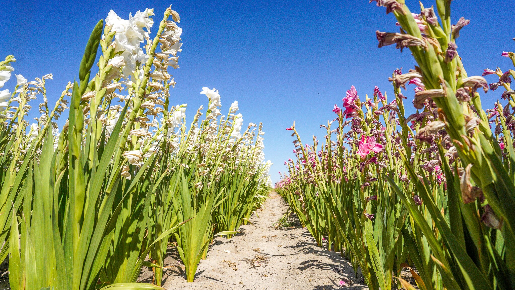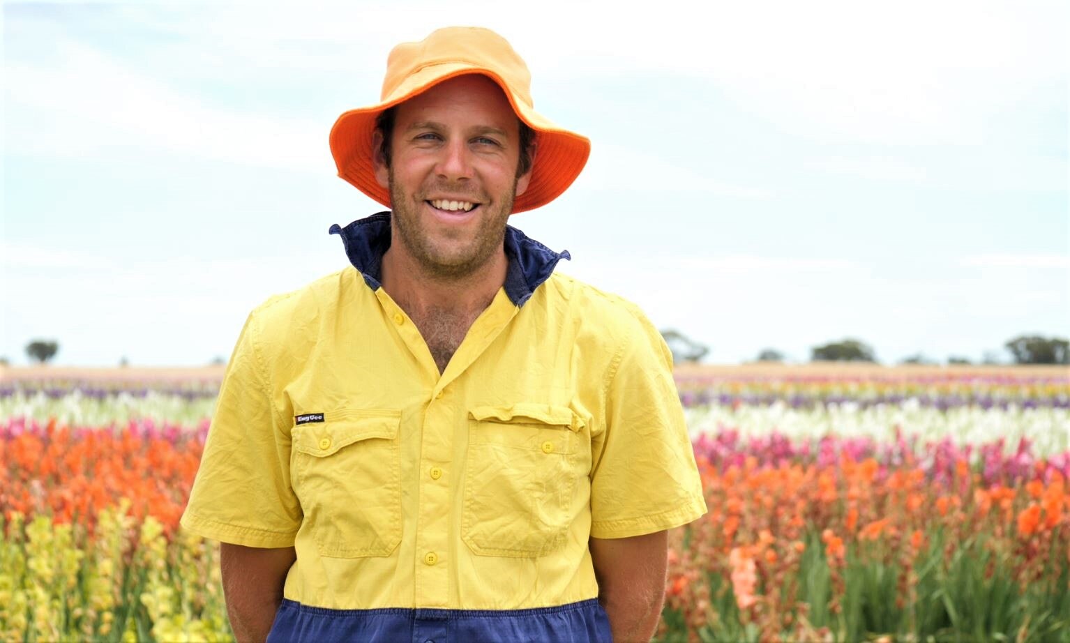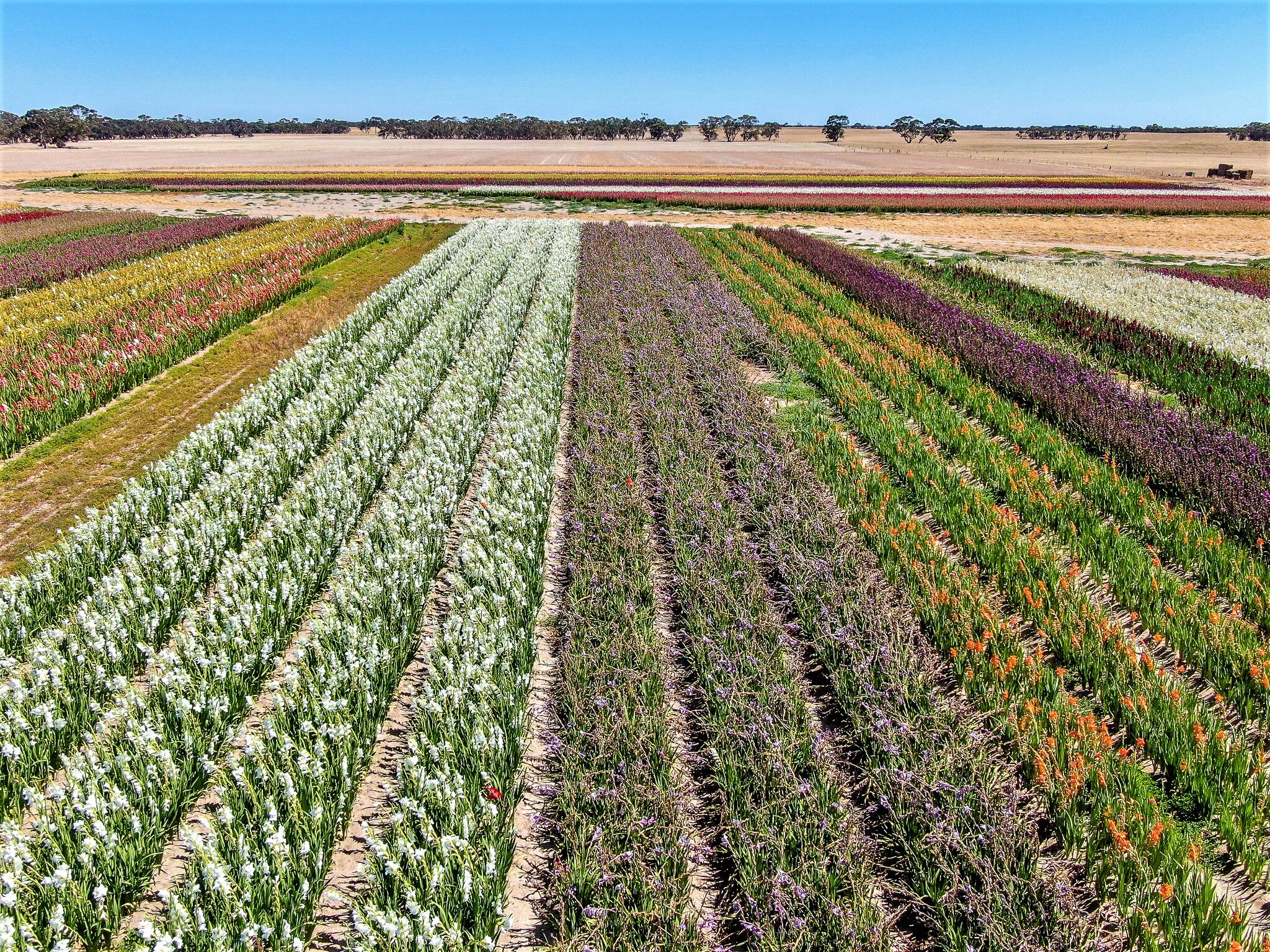 Nestled between dry paddocks in South Australia's south-east an oasis of colourful gladioli flowers bloom under the scorching summer sun.