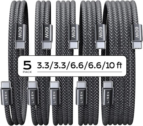These braided USB-C cables are super durable and come in a pack of five in three different lengths, so you'll be able to outfit your entire home (or throw one in every bag and backpack you own). With a USB-C to USB-C design that's great for Androids and newer iPhone models alike, these cables charge super fast. They can charge an iPhone from 0% to 80% battery in just 35 minutes.