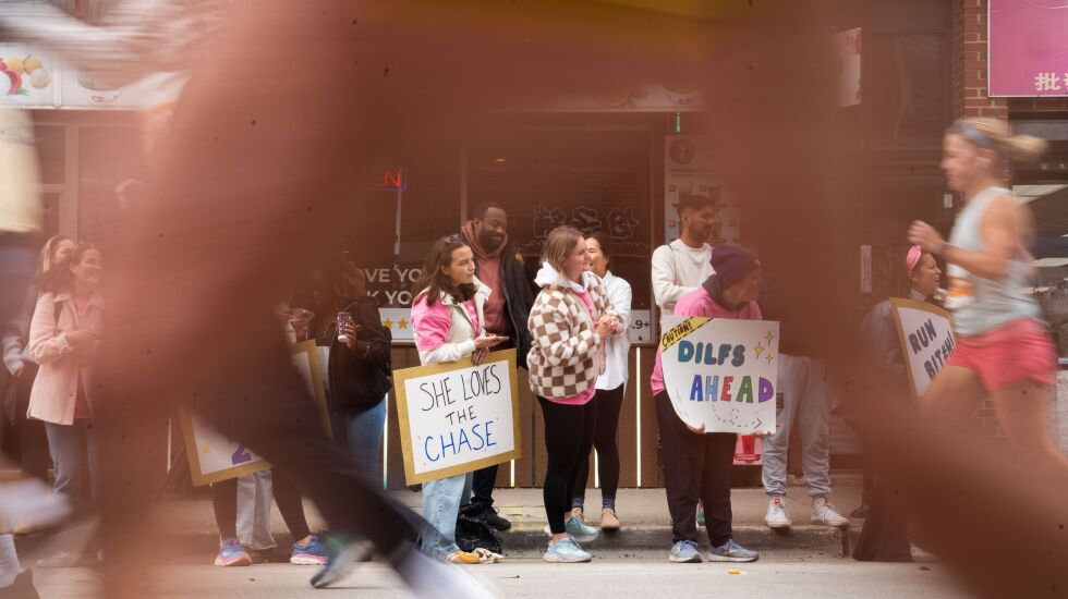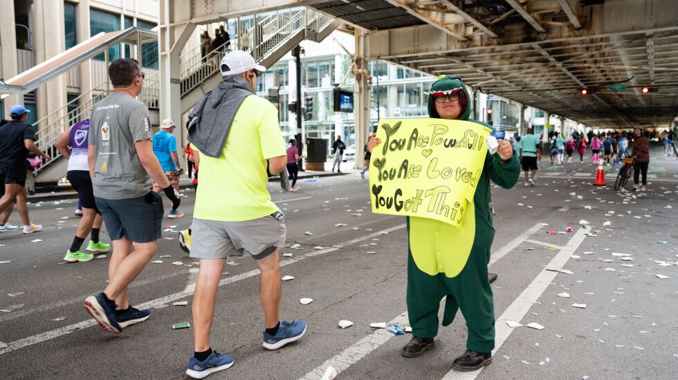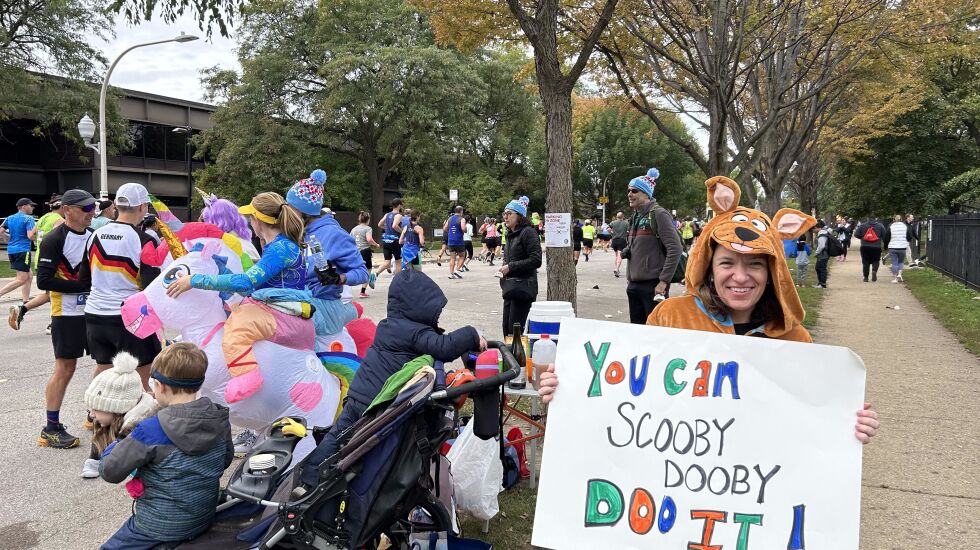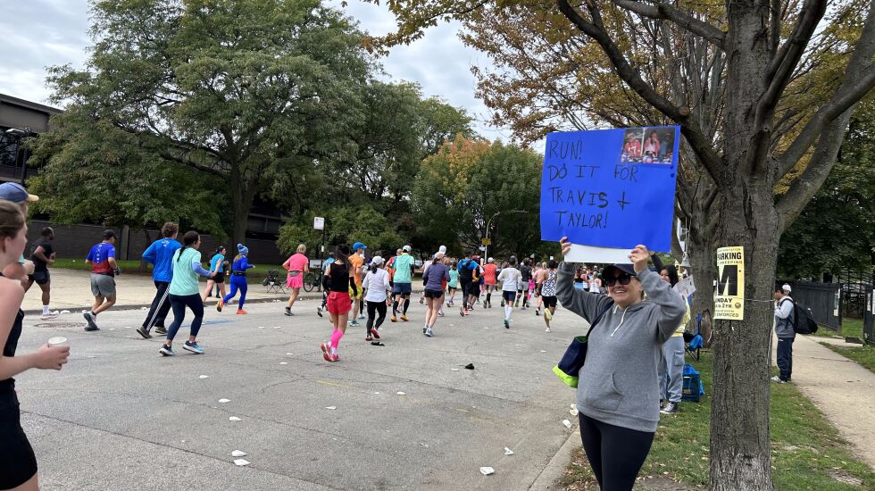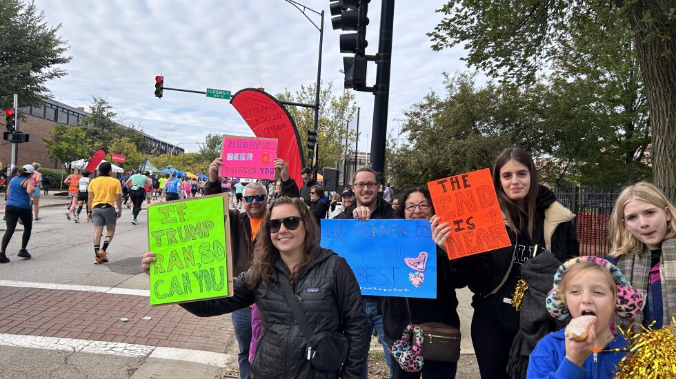 From pop culture references to digs at politicians, Chicagoans showed their creativity and wit as they cheered on runners Sunday. As people ran, walked or limped by, giving a hurried hug or exhausted high-five to spectators, they also giggled at the phrases drawn in Sharpie on poster board.