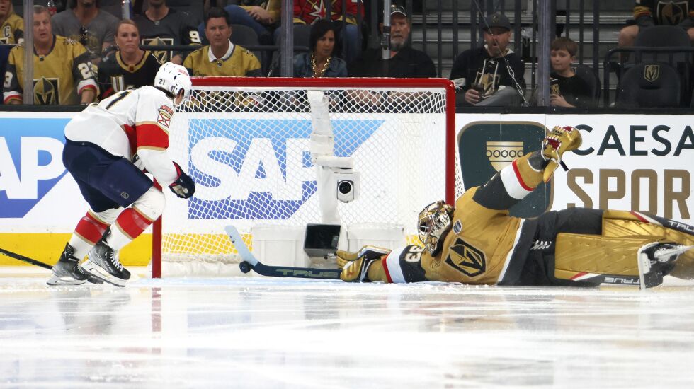 Early in the second, Hill made a desperation stick save to rob Nick Cousins of what would have been a sure goal. The save was reminiscent of the one Washington’s Braden Holtby made against Vegas — in the same crease — five years ago.