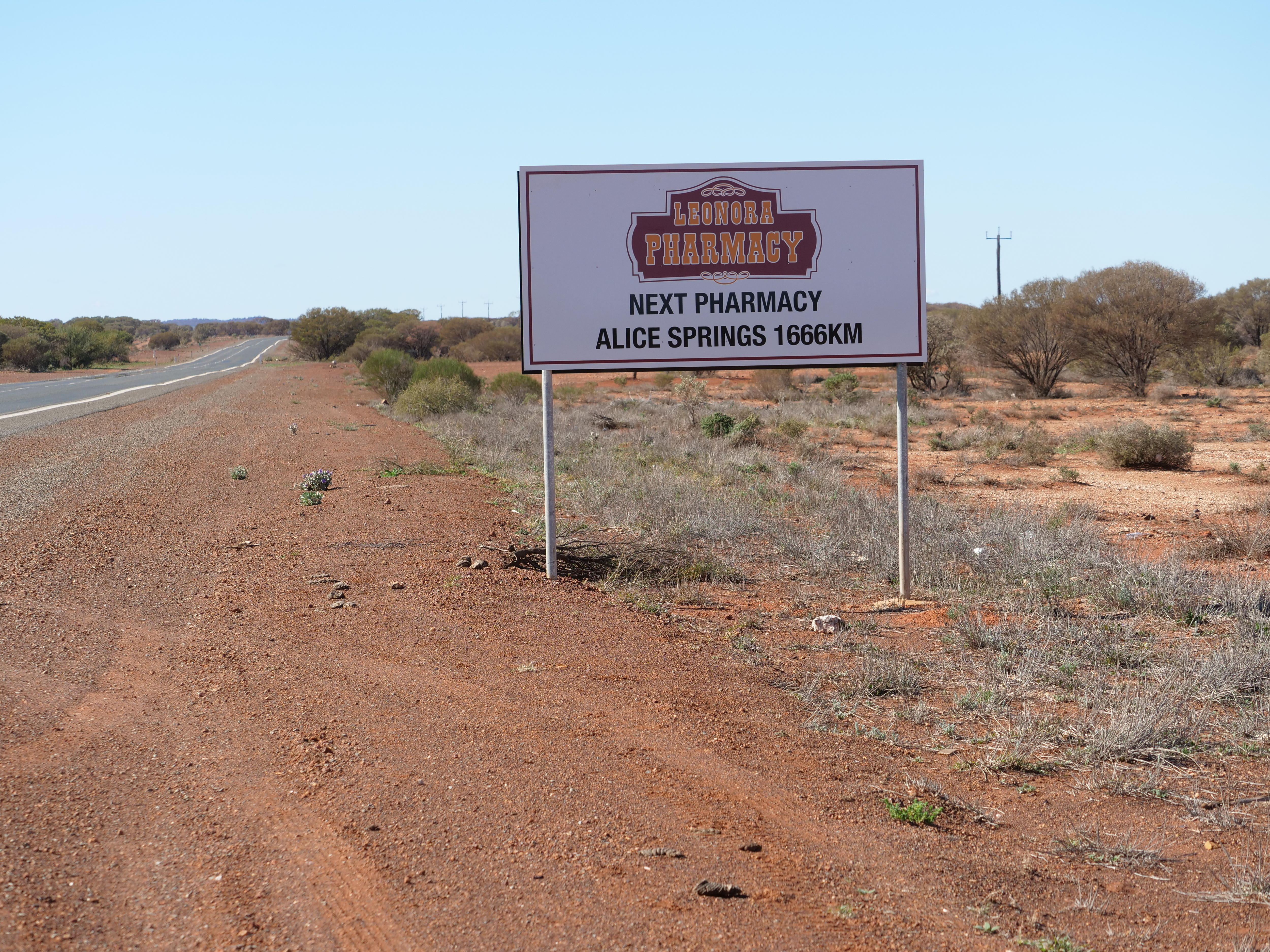 As you drive east out of the WA Goldfields town of Leonora, you head past a sign saying the next pharmacy is in Alice Springs — that's a 1,666-kilometre drive away.