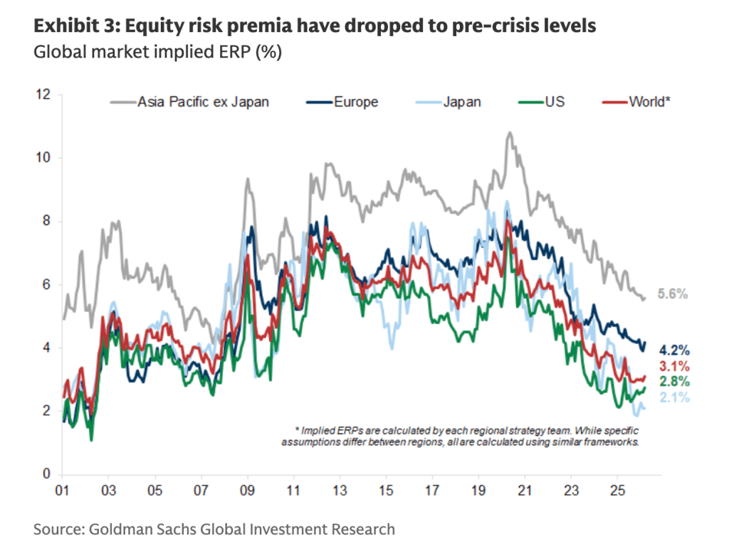 In a research note published Wednesday, Oppenheimer warned equity risk premia—a measure of how much extra return investors demand for owning stocks over safer assets—“have fallen sharply and are now, mostly, back to levels seen in the run-up to the financial crisis.” That signal, Oppenheimer wrote, has left equities “more vulnerable to disappointments or shocks” driven by technology competition or a worsening growth-inflation mix.