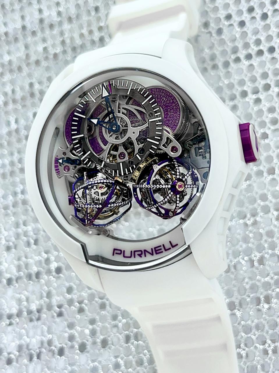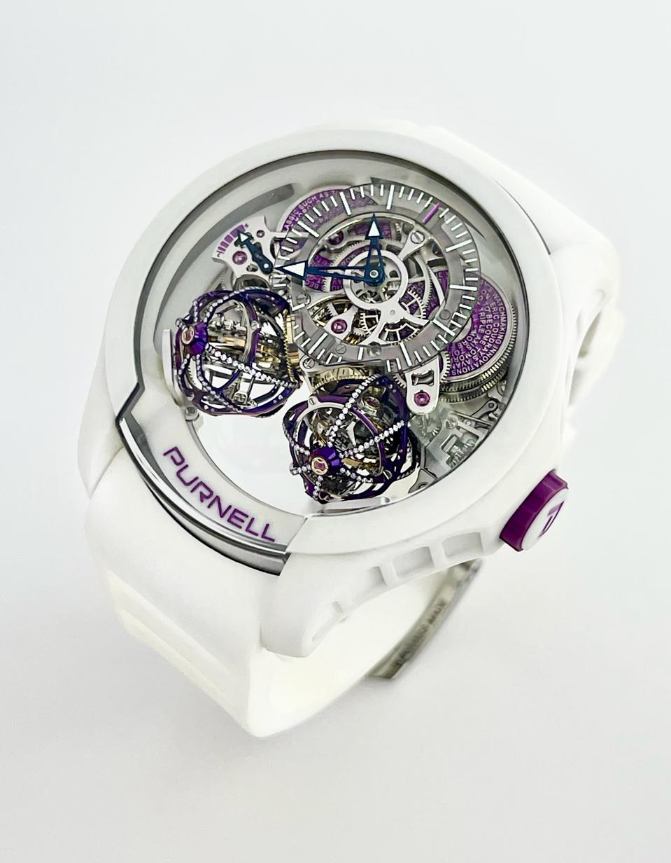 Goldsmith’s commitment to offering timepieces of unparalleled exclusivity and rarity blooms in his first design collaboration with the Swiss brand, Purnell. Producing a handful of technically and aesthetically avant-garde watches per month, Purnell’s motto is, ‘More future than past’. The initial Goldsmith and Purnell collaboration is the one-of-a-kind, Escape II White Microfiber, which Goldsmith has christened the “Purple Haze”. While it embodies a deep purple, gender-fluid color scheme and keeps time in a kinetic spectacle that pulses with hypnotic grace, the Purple Haze, like the psychedelic Jimi Hendrix song it references, must be experienced to be fully appreciated. (Click on this link to see the Purple Haze in action.)