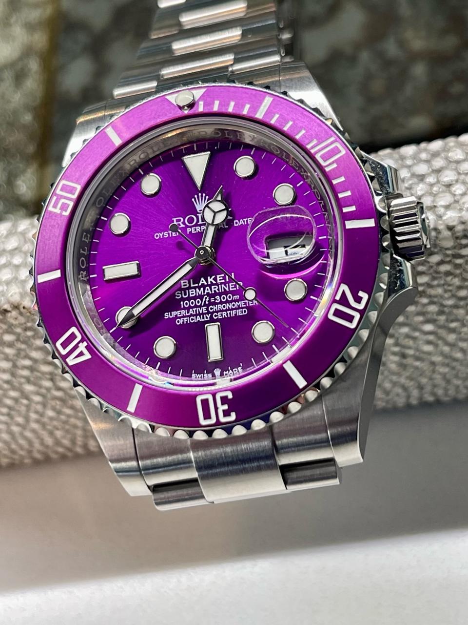 For those watch enthusiasts for whom the Purple Haze (retailing at $475,000) remains out of reach, Goldsmith & Complications is offering an exclusive, limited edition of Rolex Submariners with an eggplant purple dial and sunray finish that may well prove irresistible. The dial of this 41 mm watch also has a date function with a cyclops lens. “These Submariners are customized by Blaken, an independent German company that is neither affiliated with Rolex or licensed by them,” Goldsmith explains. In other words, Blaken created 50 Blaken Submariner Date 41 Aubergine models on demand, to expand Goldsmith’s purple reign.