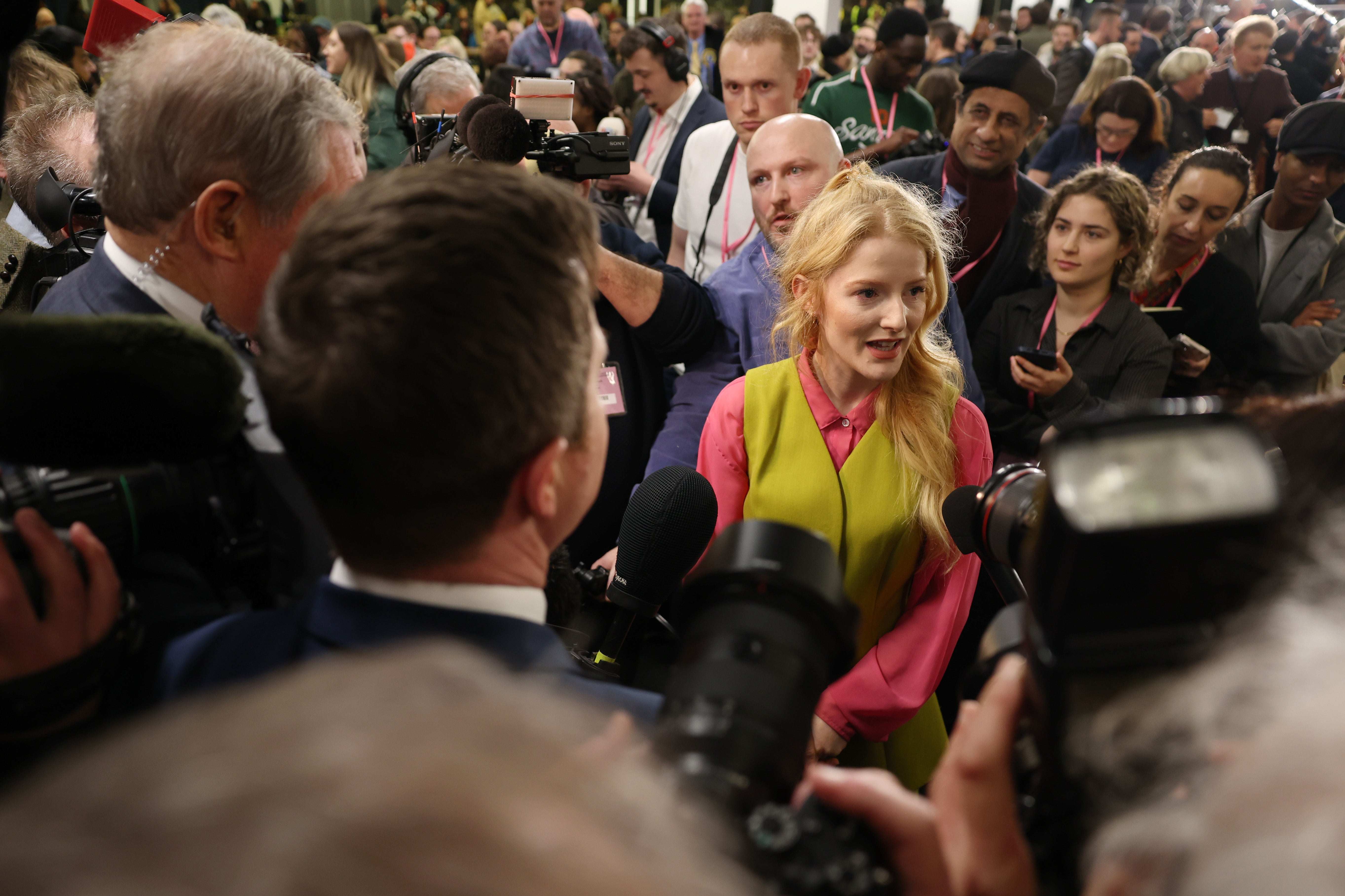 Masses of press stood at the other end of the room awaiting the arrival of the Green Party candidate, Hannah Spencer, and Reform UK's Matt Goodwin.