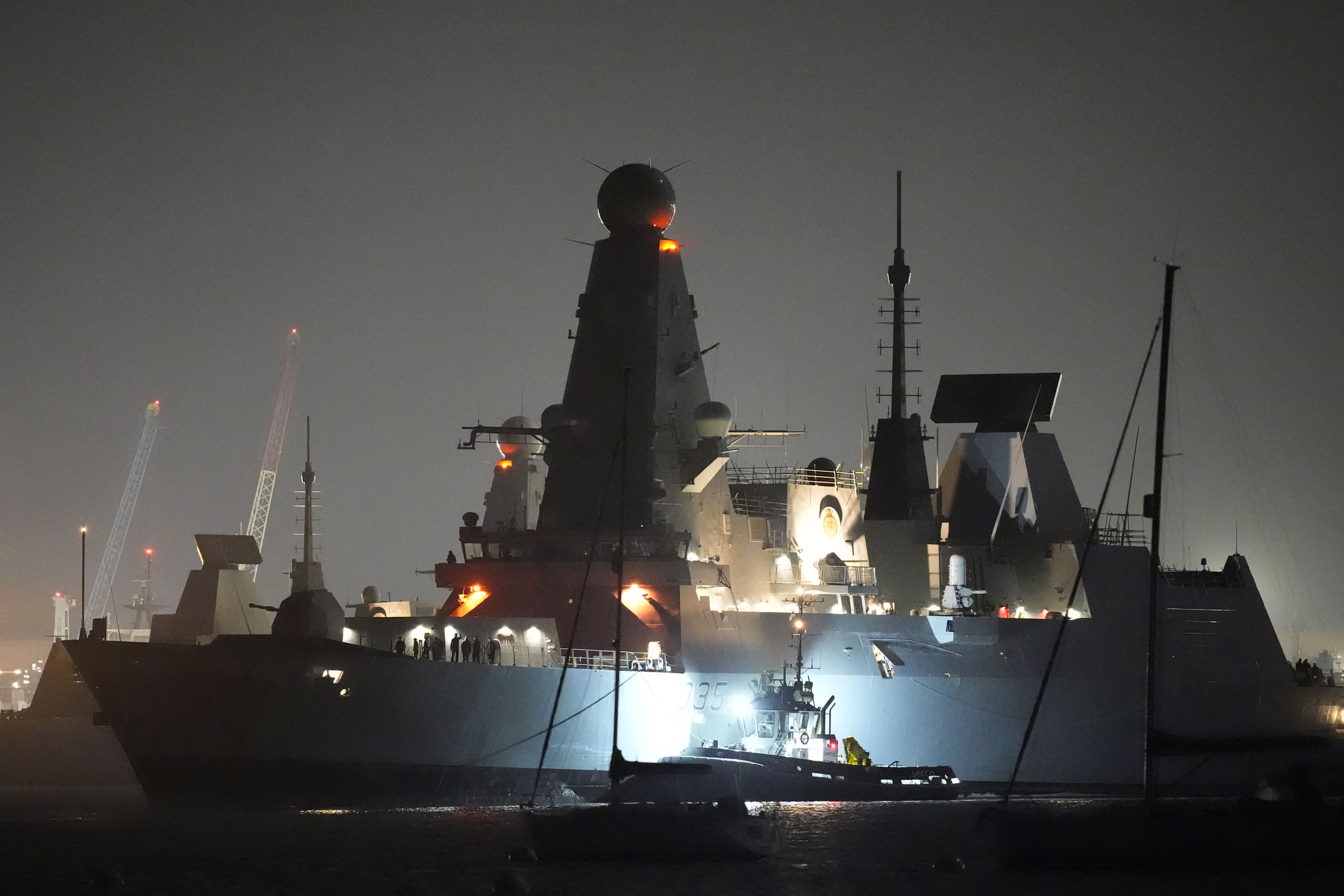 The warship, which is emblazoned with the Welsh red dragon on its prow, was pictured on Tuesday night at the Upper Harbour Ammunition Facility (UHAF) in Portsmouth harbour.