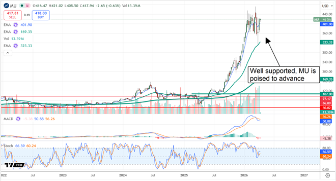 Micron’s analyst sentiment trends are robust. MarketBeat tracks 37, sufficient for a high-conviction rating; coverage has been increasing, and they peg the stock at Buy. The Buy-side bias also reflects conviction, with 90% of the ratings pegged at Buy or higher. The consensus price target assumed only 10% upside as of mid-April, but the trend remains robust, with the most recent targets suggesting at least 20% upside from the critical resistance at $450.