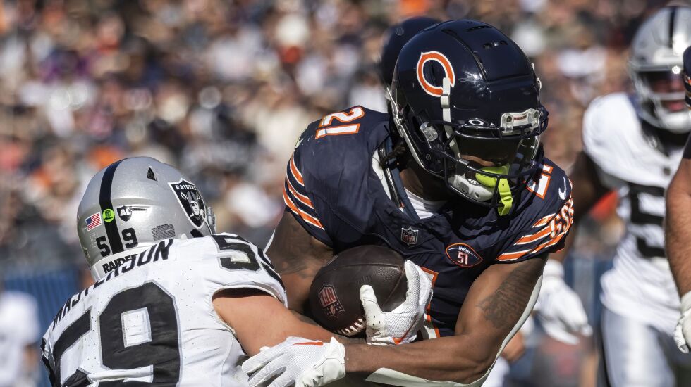 Edmunds (eight tackles, two pass breakups) continued his upward trend with an interception off a tipped pass, his second takeaway in two games. Jack Sanborn’s only tackle was a big one, stopping RB Josh Jacobs for a five-yard loss at the Bears’ 10. T.J. Edwards had two tackles but still made an impact.