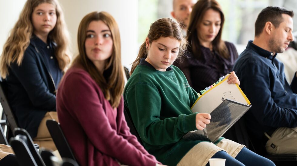 The middle schoolers giggled and wrung their hands as they prepared to deliver three-minute passages. Lillie Vogdanos, 13, said she played with a hair band on her wrist to calm her nerves as she waited her turn to read a passage in Greek.