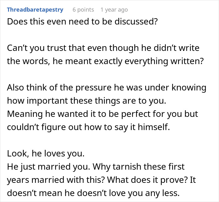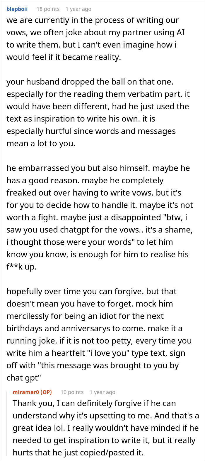 So did this new bride, who, after finding out her husband used ChatGPT for his vows, felt hurt and betrayed. After she asked for opinions online about how to approach the subject with her husband, some commenters offered a different perspective. So, a debate broke out in the comments: is using AI to write your vows really that cold and impersonal, or a saving grace for those who just aren’t good at expressing their feelings?