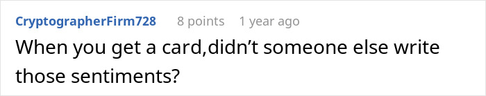 The wife didn’t want to hold a grudge but still felt hurt: “This kind of thing means a lot to me so it’s just upsetting”