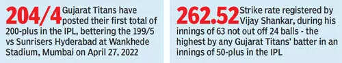 Earlier, a captivating batting display from Gujarat Titans' Vijay Shankar, a fine half-century from young top-order batter Sai Sudharsan saw the defending champions put on a formidable total on the board.