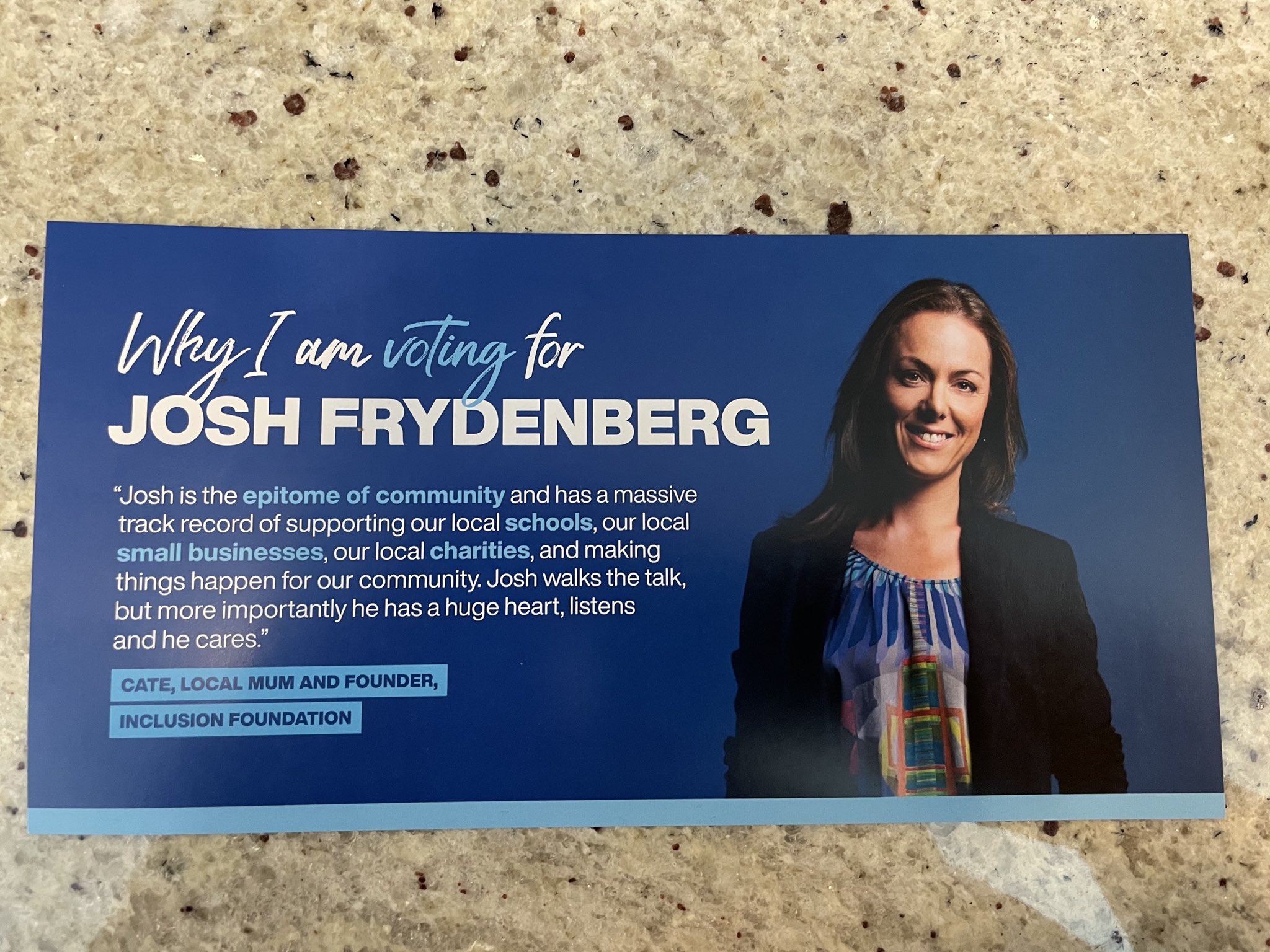 Another flyer endorsing Mr Frydenberg also appeared in residents' letterboxes from Catherine Sayers, the founder of Inclusion Foundation, a charity advocating for people living with Down syndrome.