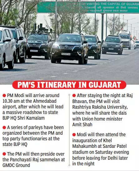 More importantly, the BJP is looking to set the ball rolling in its build-up to the Gujarat assembly election with Prime Minister Narendra Modi's two-day visit. The PM's massive roadshow and his presiding over a mega rally of elected panchayat representatives numbering close to 2 lakh is being projected as the BJP sounding the Gujarat assembly election bugle.