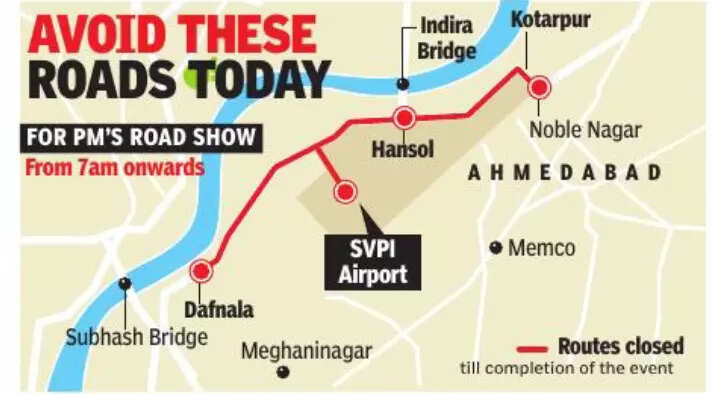 Lakhs of partymen will congregate for the victory roadshow which will be led by the PM from the airport to BJP headquarters 'Shri Kamalam' in Koba, Gandhinagar. The roadshow on Friday is being showcased as the BJP's national celebration of its spectacular performance in the polls.