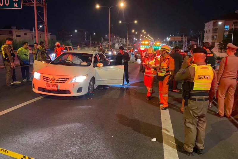 The victim was in the driver’s seat of a white Toyota Altis. He was identified as Anuwat Yatniyom, 34. The man was shot in the neck.