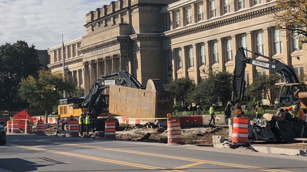 In front of the high school and for a stretch of Stony Island, construction crews were at work widening the street. The avenue is getting extra lanes to make up for closing the portion of Cornell Avenue that ran through Jackson Park — land now part of the Obama Center campus. Once completed, the center will be connected to the Museum of Science and Industry by a grand walkway on what was once Cornell.