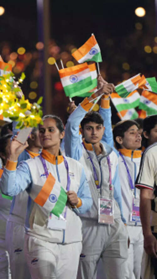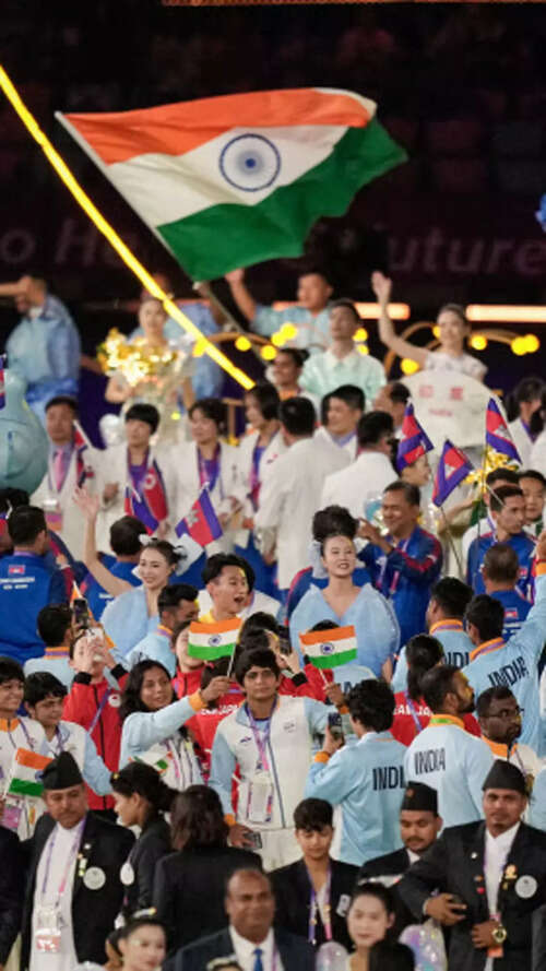 <p>Indian players waving flags during the closing ceremony of the 19th Asian Games in Hangzhou, China.<br /></p>PTI8/10:Hangzhou Asian Games declared closed in a glittering ceremony