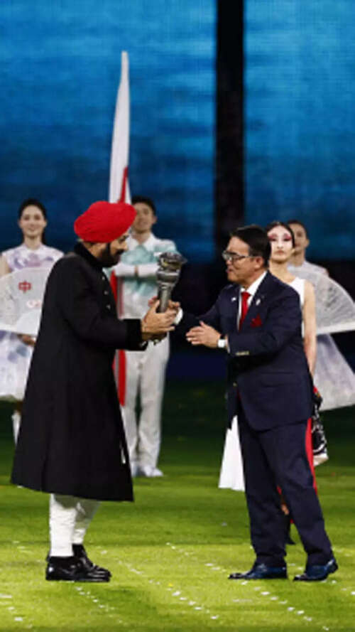 <p>Acting president of OCA Randhir Singh hands over the torch to the Governor of Aichi Prefecture Hideaki Omura at the handover ceremony during the closing ceremony of the 19th Asian Games in Hangzhou, China.<br /></p>Reuters4/10:Hangzhou Asian Games declared closed in a glittering ceremony