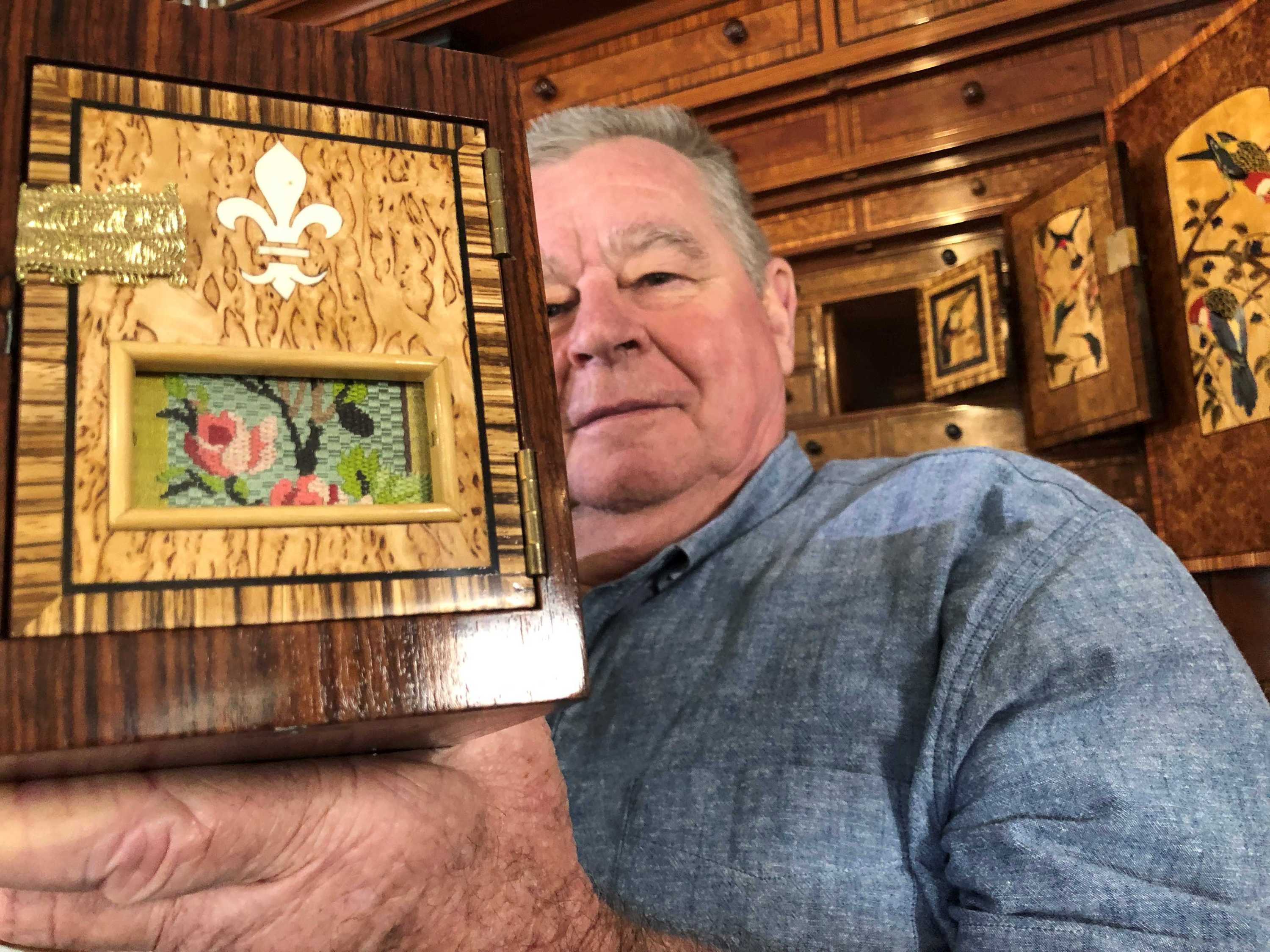 The cabinet took six-and-a-half years to make and has 92 drawers. It was made from 34 types of timber, four rare species of shell and 17 types of precious and semi-precious stones.