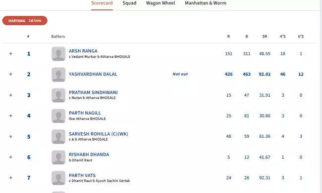 Despite Ranga's dismissal for 151 by Atharva Bhosale, Dalal continued his aggressive approach, contributing significantly to Haryana's imposing total of 732 for eight wickets at the close of play on Day 2.