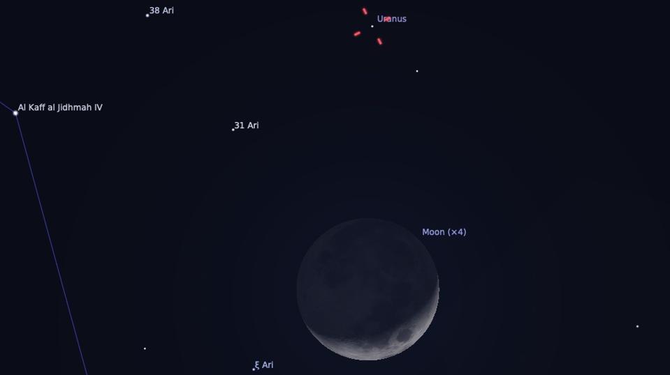 Only on Sunday will Uranus appear to be about a degree north—above—the crescent Moon.