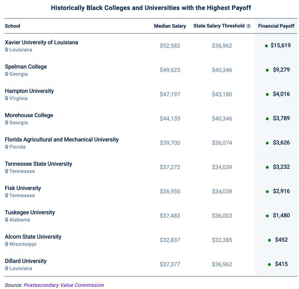 Most HBCUs are located in southern states where median earnings are lower overall. At the top of OnlineU’s list of HBCUs with the greatest pay off is New Orleans Xavier University. The median salary for graduates from Xavier is $52,582 compared to the $36,962 median salary for other Black graduates with the same level of education in Louisiana, representing a whopping $15,619 difference.