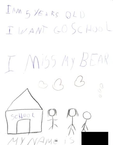 In one drawing, a group of stick figures stands outside a school, with a caption that reads, “I miss my bear.”