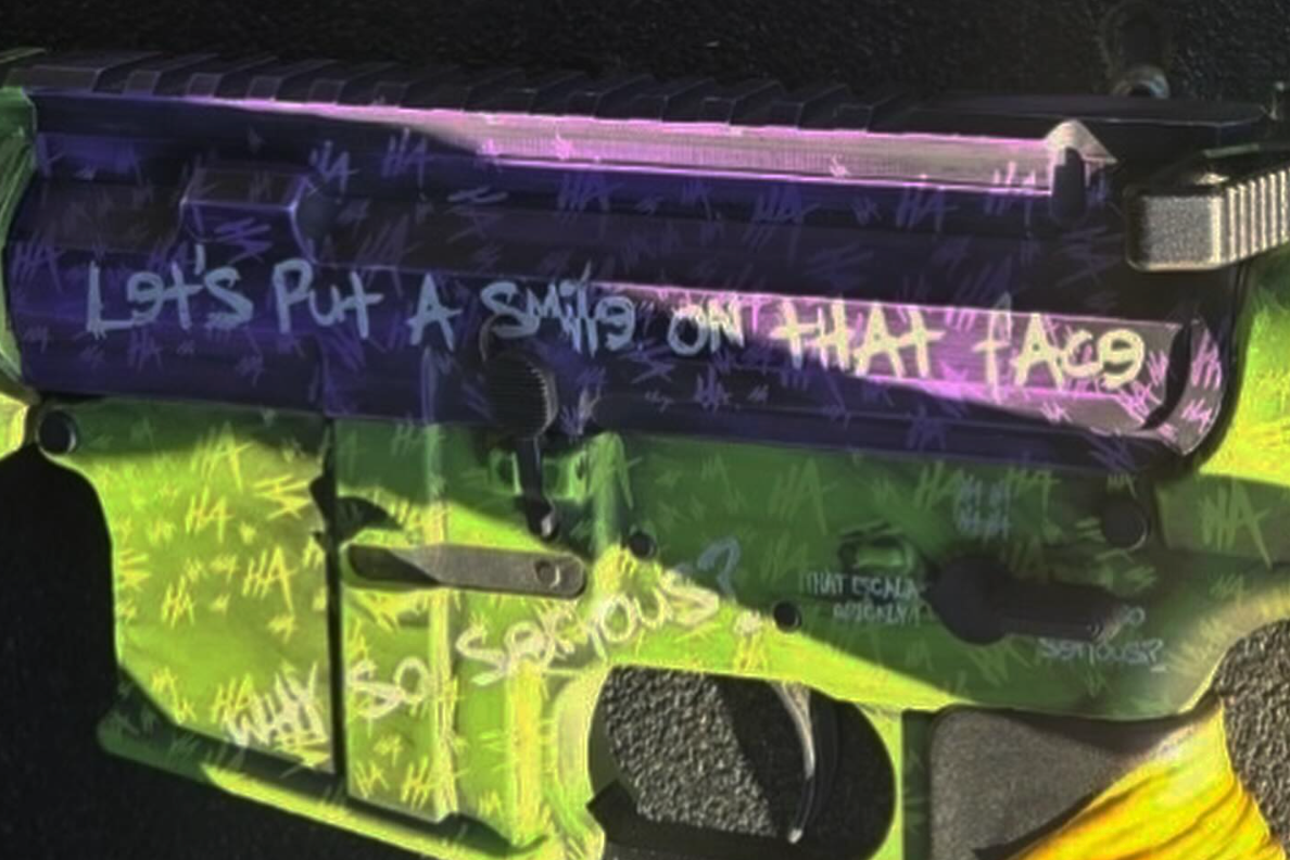 The rifle was painted purple and green, along with ominous phrases including “why so serious?” and “let’s put a smile on that face,” according to photos released by the department.
