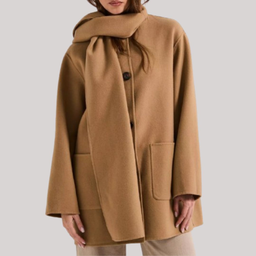 Unlike some designs I’ve seen, this scarf detail looks actually substantial and cosy. It saves Helen from having to bring separate accessories with her and naturally has a sense of cohesion as it’s made from the same tan wool material as the rest of the coat.