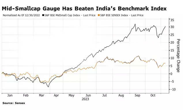 Small- and mid-cap stocks have trounced their larger peers this year amid bets that domestic-facing names will benefit more from the nation’s economic growth that is among the world’s fastest. The S&P BSE MidSmall Cap Index has surged 30% since Jan. 1, more than four times the gain in the benchmark S&P BSE Sensex Index.