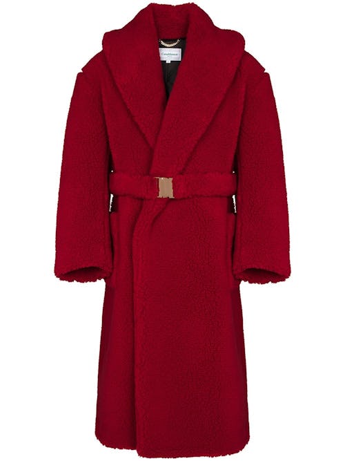 Casablanca typically holds our attention with its resort-ready summer attire, but this double-breasted and belted shearling coat in a can’t-miss red shows there isn’t a season the brand can’t tackle.