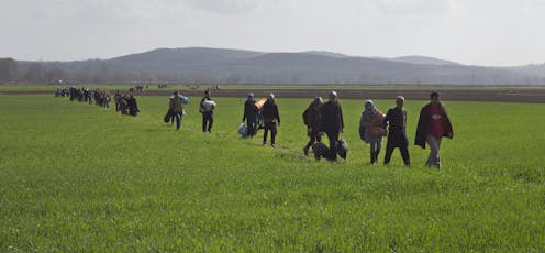 In this 2016 photo, Syrian refugees and migrants walk along a path near the Greek border used by thousands to walk to central Europe. (AP Photo/Petros Giannakouris, File)