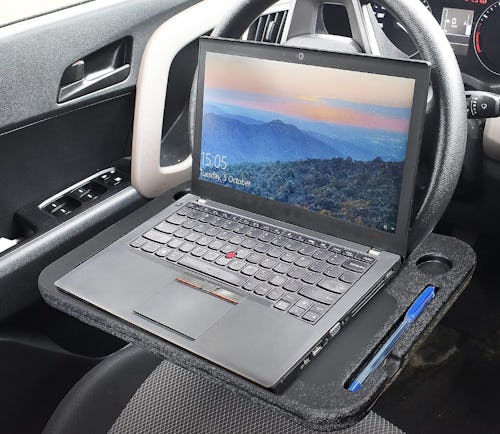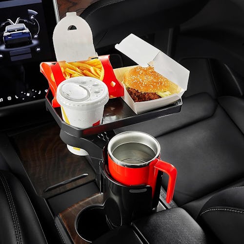 This oversized cupholder tray is a total upgrade for eating in the car. The 10-inch tray holds full meals, extra drinks, and even your phone — with cable holes to keep it charged, too. It rotates 360 degrees, so you can swing it right where you need it, and the adjustable base fits most cars, SUVs, and trucks. Plus, it accommodates 18– to 40-ounce water bottles with included coasters and stabilizing tabs.