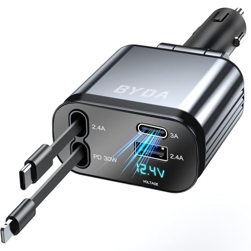 Amazon -A smart upgrade for anyone who needs to keep their phone powered up on the go, this four-in-one charger saves space and streamlines your setup. The rotating design fits snugly into a 12-volt socket, while the 31-inch retractable cables keep cord clutter to a minimum. It comes in styles for devices with Lightning and USB-C connectors, so you can find the option that suits your needs best.