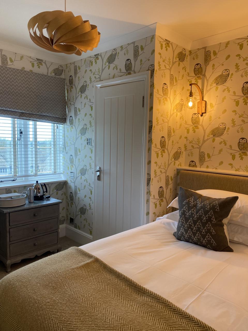 The series of bedrooms are found across the two floors and are nicely spaced out. Giving nods to the local area are the hand-crafted bed-throws made by the Cotswold Woollen Weavers, found in Lechlade. In fact, the woven textiles, contemporary lighting and cosy tweaks mean that each room oozes the essence of hygge. There are sheepskin throws, velvet cushions and charming nature-inspired wallpapers – featuring botanical motifs, owls and trees. In fact, a Danish family has owned the estate for over four decades and you can feel the Nordic influence throughout the new venture. Adding to what feels like an upscale hotel vibe, each bedroom has its own ensuite bathroom with French-style tiling, some with stand-alone tubs and walk-in rain showers.