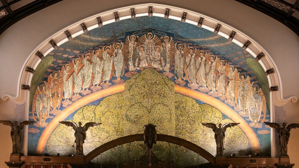 The church sports seven large Tiffany stained-glass windows and the 40-by-30-foot “Tree of Life” mural high above the altar by renowned painter Frederic Clay Bartlett.