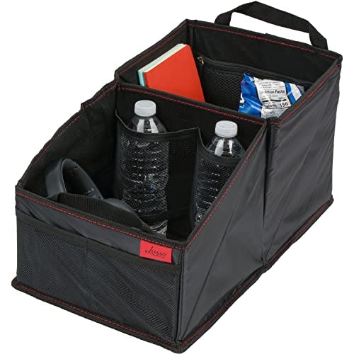 Lusso Gear Car Seat Organizer with Cup Holders for Front, Back, Passenger Seats, Truck and Van, 9 Auto Storage Compartments for Travel Organization of Trunk, Seats, Mobile Office (Black w Red Stitch)